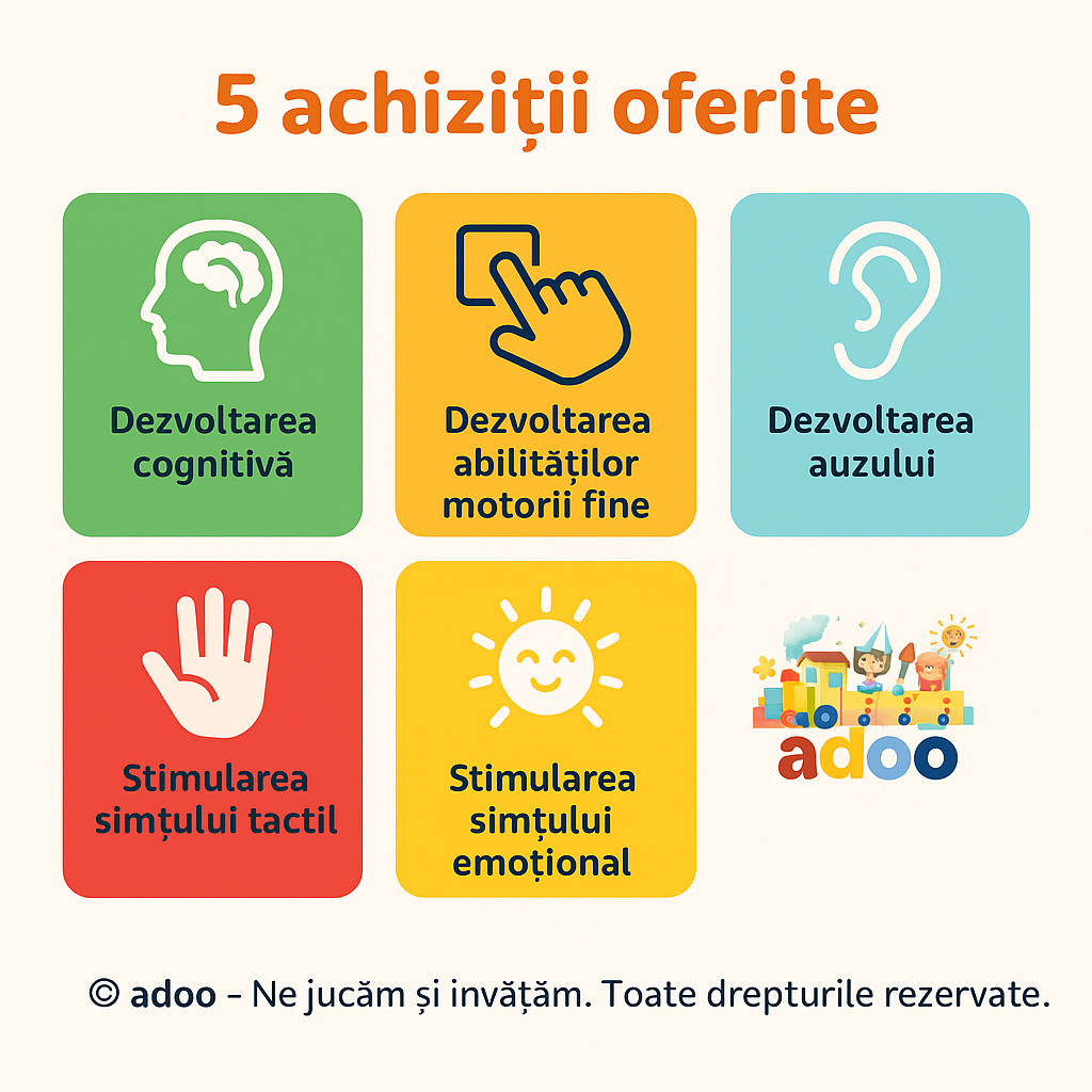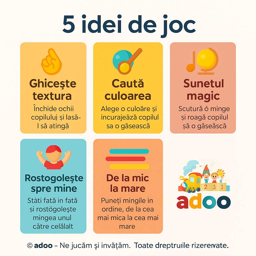 Un set colorat și distractiv de 6 mingi senzoriale create special pentru a stimula simțul tactil, coordonarea și motricitatea bebelușului. Fiecare minge are o textură și dimensiune diferită, oferind o experiență de joacă variată și educativă. Perfecte pentru masaj, joacă pe covorașul de activități sau exerciții de prindere și aruncare. Realizate din material moale, non-toxic și sigur pentru bebeluși, ușor de curățat și de ținut în mânuțe mici.