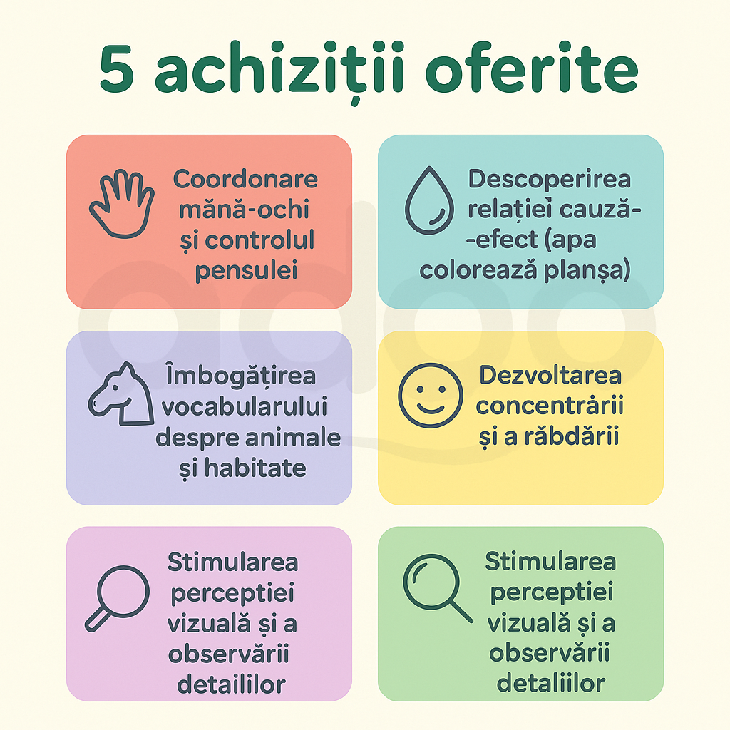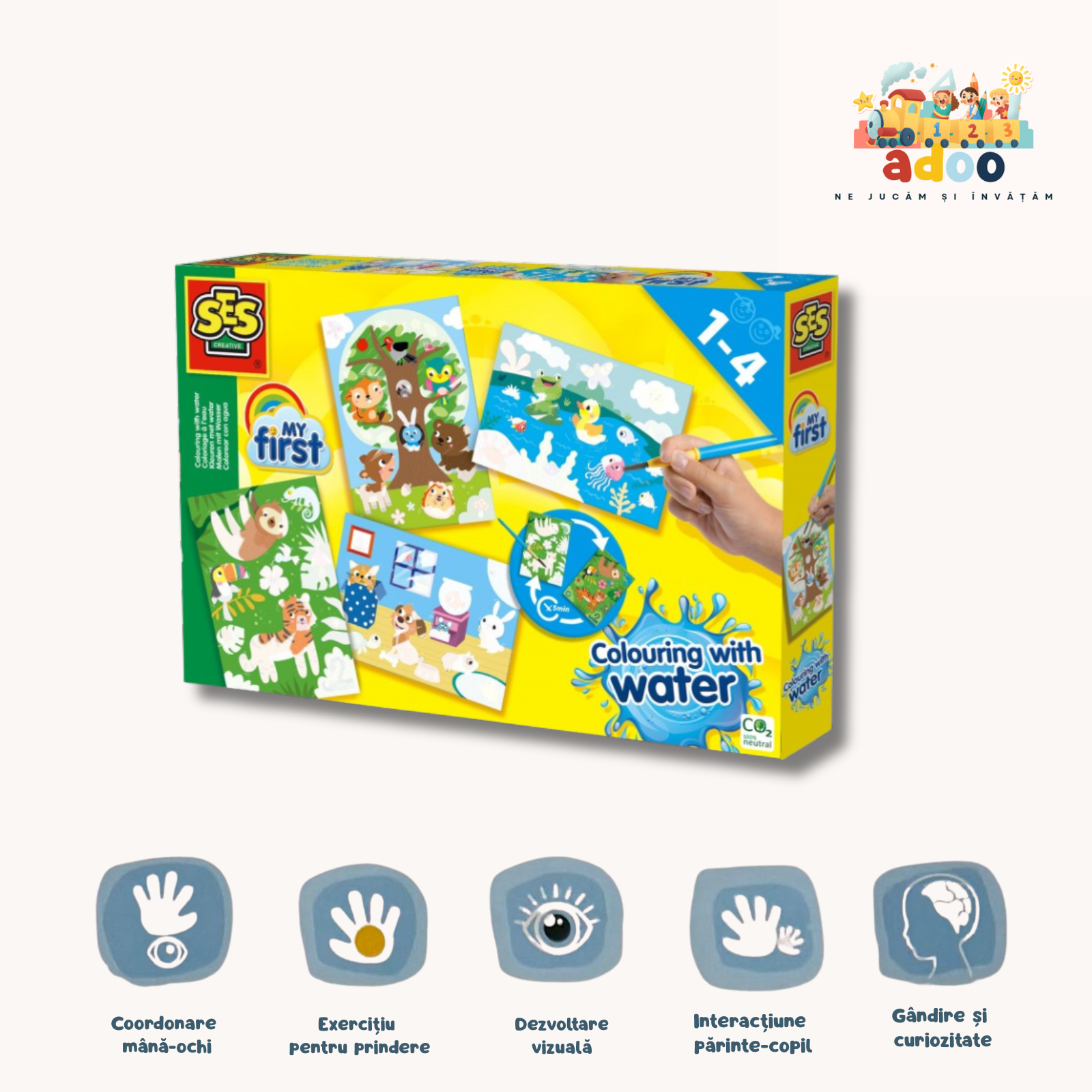 Setul „My First – Colorează cu apă: Animale ascunse” este un joc creativ ideal pentru micuți: include pagini care îşi dezvăluie surpriza (animal ascuns) când acestea sunt umezite cu pensula, fără murdărie sau vopsele clasice. Este perfect pentru activități acasă sau în deplasare, oferind distracție și dezvoltare într‑un format sigur și ușor de folosit.