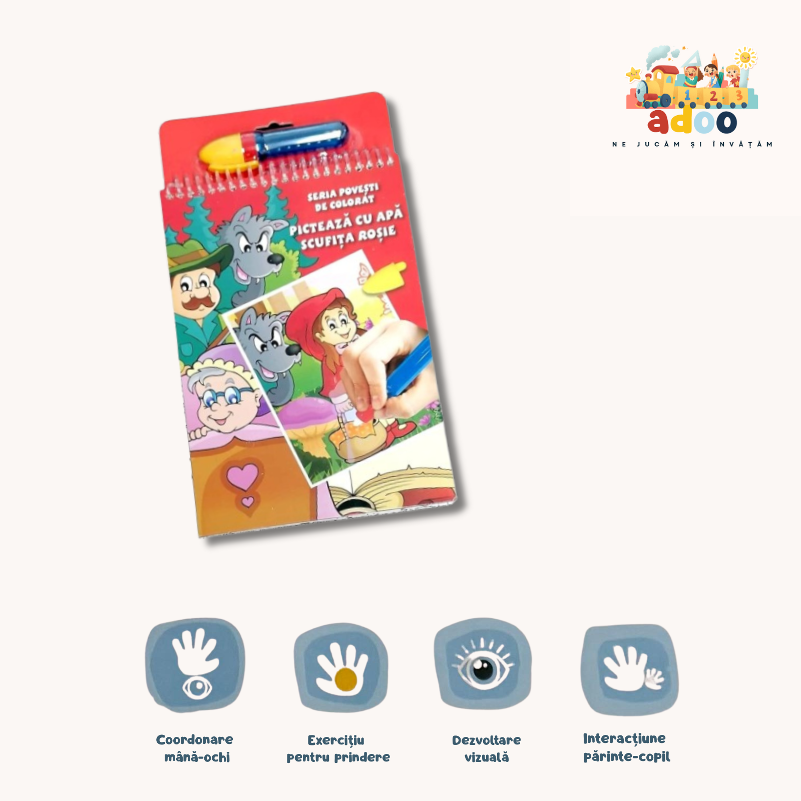 Picteaza cu apa contine 6 imagini reutilizabile + marker cu apa. Pentru a colora se umple markerul cu apa apoi se coloreaza suprafetele ca si cu o pensula, fara sa se apese sau insiste in acelasi loc. Culorile vor aparea, iar cand foaia este ulterior uscata, devine din nou alba si se poate colora din nou. Este un articol ideal in calatorii, nu pateaza si nu murdareste.
