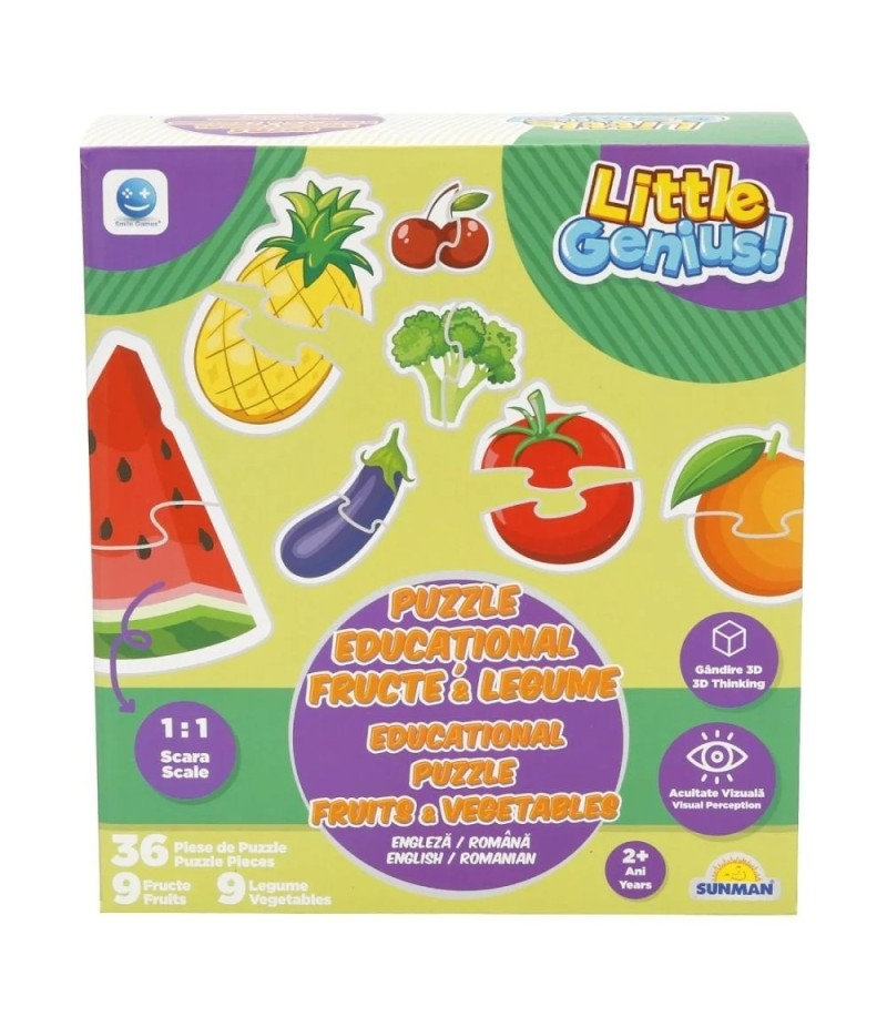 Setul de puzzle educational contine 36 de piese de puzzle cu 9 fructe si 9 legume. Puzzle-ul ajuta copii sa isi imbunatateasca coordonarea ochi-mana si sustine dezvoltarea cognitiva si sociala. Cand este jucat impreuna cu mai multe persoane, imbunatateste comunicarea. Puzzle-ul ajuta copii sa invete concepte din viata de zi cu zi. Puzzle-ul contine urmatoarele fructe si legume:cireasa, ananas, mar, pepene, strugure, portocala, para, banana, capsuna, porumb, salata, morcov, broccoli, rosie, praz, vanata, dovlecel si dovleac. Dimensiune articol ambalat:23 x 8 x 20.5 cm Varsta recomandata:2 ani +