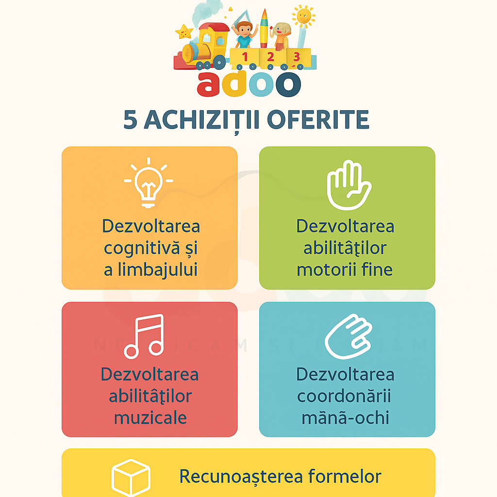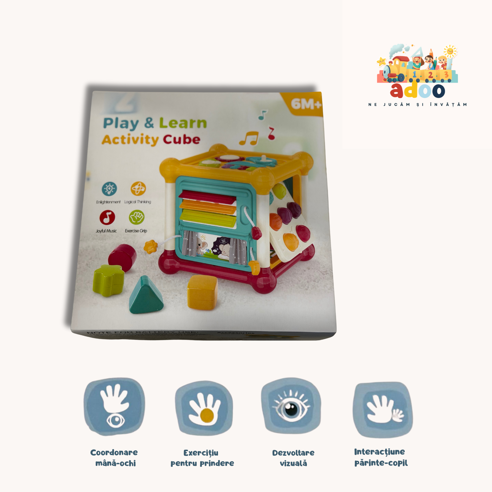 Cub de Joacă și Învățare pentru Bebe 6+ luni – Activități Montessori, Lumini și Sunete Transformă timpul de joacă într-o experiență educativă cu Play & Learn Activity Cube, un cub de activități colorat, perfect pentru bebelușii de la 6 luni în sus. Conceput pentru a stimula toate simțurile, acest cub este jucăria ideală pentru primele explorări ale copilului. Beneficii pentru dezvoltarea copilului 🖐️ Coordonare mână–ochi – butoane, forme și elemente de tras/împins care încurajează mișcările precise. ✊ Exercițiu pentru prindere – piesele și elementele de pe cub ajută la întărirea musculaturii mâinilor și degetelor. 👁️ Dezvoltare vizuală – culorile contrastante și detaliile atractive captează atenția și stimulează percepția vizuală. 🤱 Interacțiune părinte–copil – ideal pentru jocuri împreună, vorbire, numărare și explorarea formelor și culorilor. Caracteristici principale Recomandat de la 6 luni+ Design 3D cu mai multe fețe pline de activități (butoane, forme geometrice, rotițe etc.) Elemente muzicale pentru sunete vesele care înveselesc copilul Ajută la dezvoltarea gândirii logice, a curiozității și a spiritului de explorare Realizat din materiale sigure pentru copii, cu margini rotunjite Acest cub de activități pentru bebeluși este alegerea perfectă pentru părinții care își doresc o jucărie educativă, interactivă și distractivă, ideală pentru acasă sau pentru cadou.