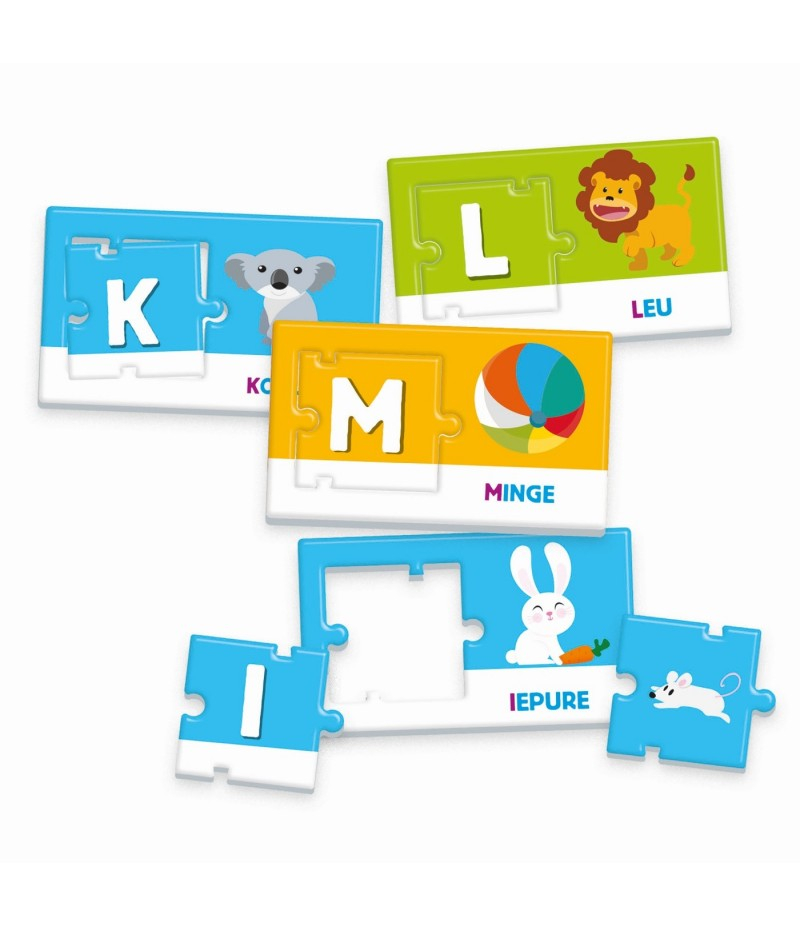 Alfabetul este joc educativ special conceput pentru copiii de la 3 ani. Contine cartonase ilustrate cu animale si litere, pentru o prima abordarea a alfabetului intr-un mod placut si distractiv, invatand literele si sunetul lor. Jocul indeamna copilul sa scrie primele cuvinte in romana si engleza. Setul contine 30 de cartonase cu imagini si cuvinte, 30 de piese de puzzle si 1 manual de instructiuni. Valori dezvoltate citirea si scrierea, logica si spiritul de observatie, limba straina, autonomia, sociabilitatea, aptitudinile motorii, memoria, creativitatea si fantezia