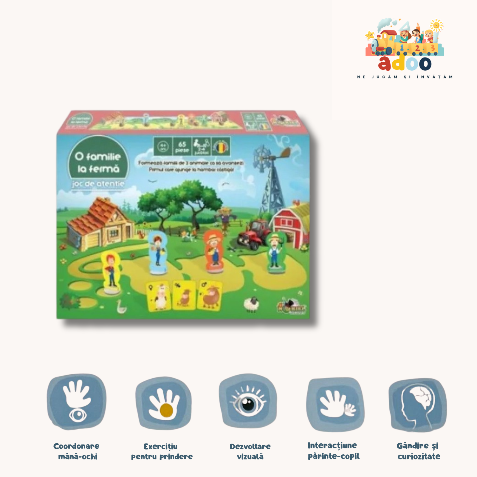 Transformă o seară între copii sau cu familia într-o aventură la fermă cu acest joc de societate plin de farmec. Fiecare jucător își alege o figurina de fermier și pornește pe un traseu care îl conduce spre hambar. Obiectivul: să aduni familii de animale — mamă, tată și pui — pentru a avansa înainte pe traseu și să fii primul care ajunge la destinație. Pachetul include tot ce trebuie pentru distracție: o planșă de joc, 54 de cartonașe cu animale, 2 cartonașe-sperietoare de ciori, 4 figurine de fermieri cu suporturi și un regulament. Jocul este recomandat copiilor de la 4 ani în sus, pentru 2-4 jucători, fiind potrivit atât pentru grădiniță, cât și pentru acasă. Dimensiunea produsului ambalat este aproximativ 30 × 4 × 23 cm. Beneficiile: încurajează recunoașterea și asocierea vizuală a animalelor dezvoltă atenția, observarea și logica prin formarea familială promovează cooperarea, dar și competiția sănătoasă între copii design adaptat vârstei mici: piese mari, culori vii, reguli simple Un joc ideal pentru părinții care vor o activitate educativă şi distractivă, ce îmbină joaca cu învățarea într-un mod prietenos pentru copii.