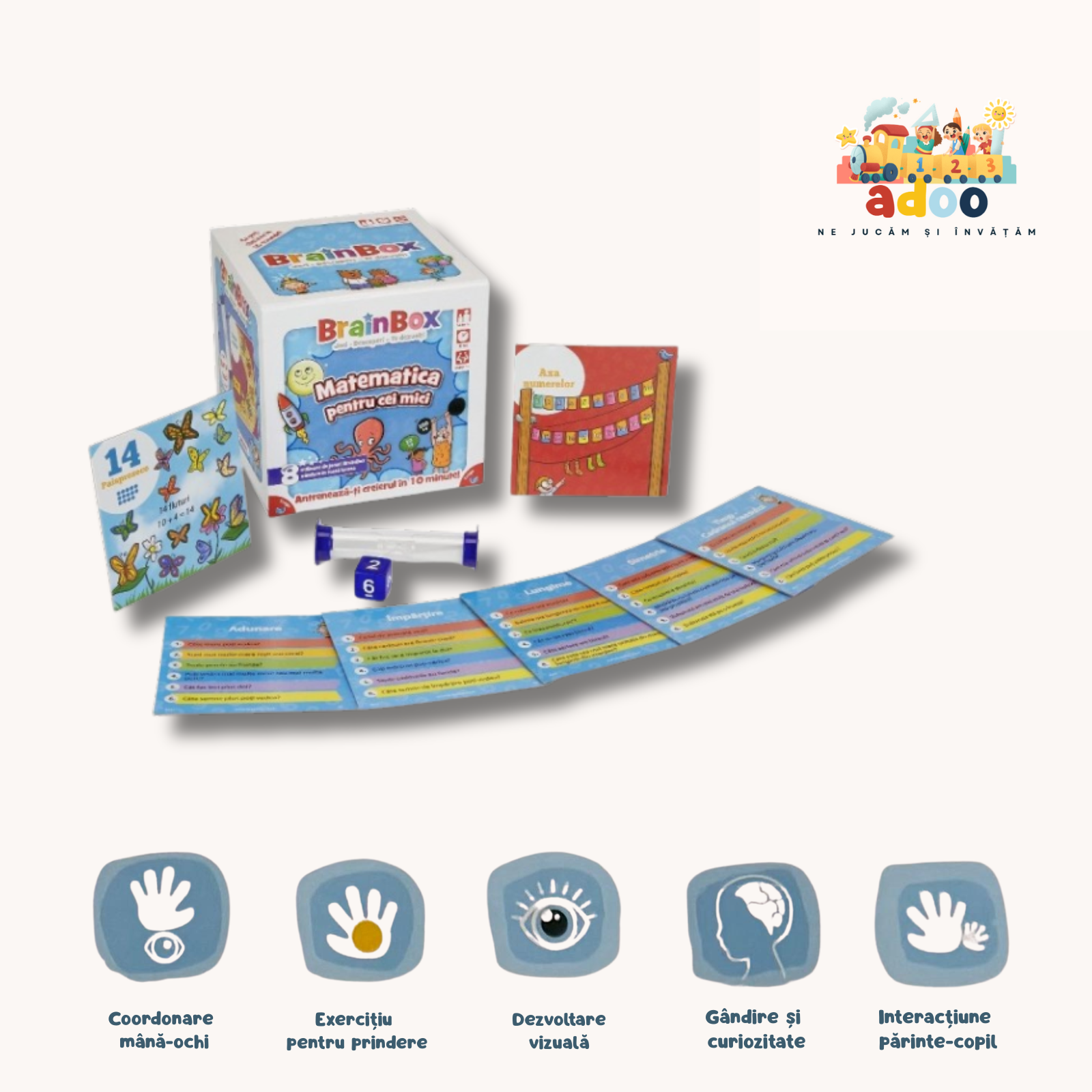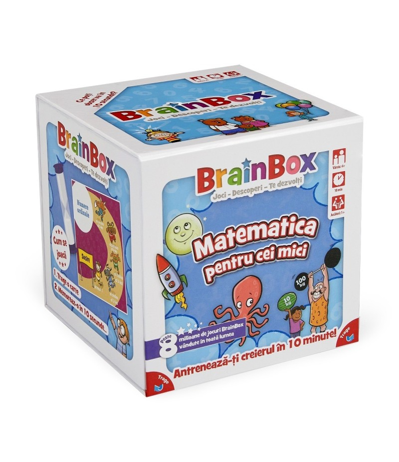 Un joc educativ de memorie și observație care îi ajută pe copii (5+ ani) să își dezvolte atenția, logica și încrederea în abilitățile de calcul. Bazat pe programa școlară, jocul conține 55 de cărți ilustrate cu teme precum numărarea, adunarea, formele geometrice și fracțiile. Copiii au la dispoziție 10 secunde pentru a memora informațiile de pe o carte, apoi trebuie să răspundă la întrebări despre ceea ce au văzut. Poate fi jucat individual sau în familie, oferind o modalitate distractivă de a învăța matematica prin joc. Conține: 55 cărți de joc (330 de întrebări), 1 zar, 1 cronometru de 10 secunde și regulile jocului.