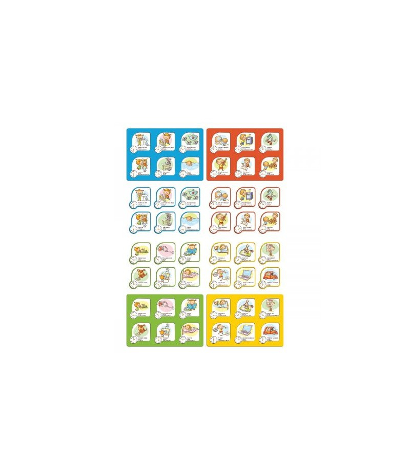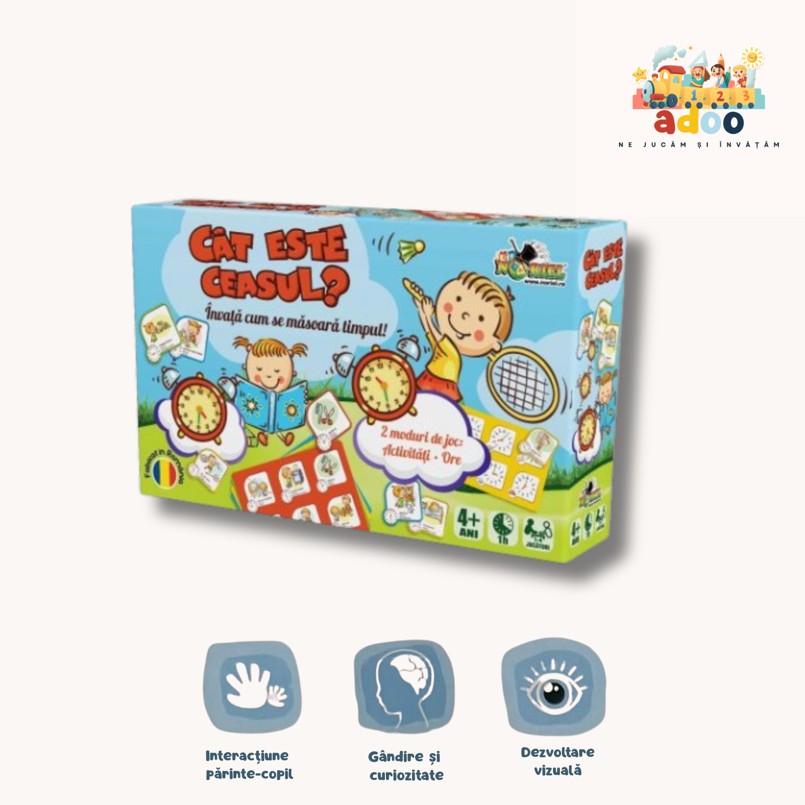 Descoperă un mod distractiv și interactiv de a învăța să citești ceasul cu jocul educativ „Cât este ceasul?”! Ideal pentru copiii curioși și dornici să învețe, acest joc combină activități zilnice familiare cu orele corespunzătoare, ajutându-i pe cei mici să asocieze timpul cu momentele din zi. Fiecare jucător alege o planșă și trebuie să o completeze cu cartonașele potrivite, pe care sunt ilustrate aceleași ore și activități. Câștigă primul jucător care își completează corect întreaga planșă — un mod amuzant de a învăța și de a petrece timp de calitate în familie! Conținutul setului: 24 cartonașe ilustrate cu activități și ore 4 planșe cu două fețe (una cu activități, cealaltă cu ore) Beneficii educative: Ajută copiii să învețe să citească ceasul (analogic și digital) Stimulează atenția, memoria și gândirea logică Încurajează recunoașterea și asocierea activităților zilnice Promovează interacțiunea socială și jocul în familie Informații suplimentare: Potrivit pentru: Băieți și fete Vârstă recomandată: 4 – 7 ani