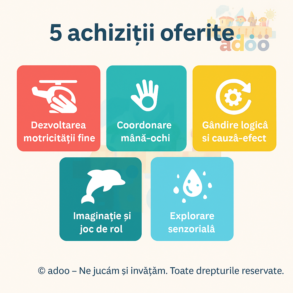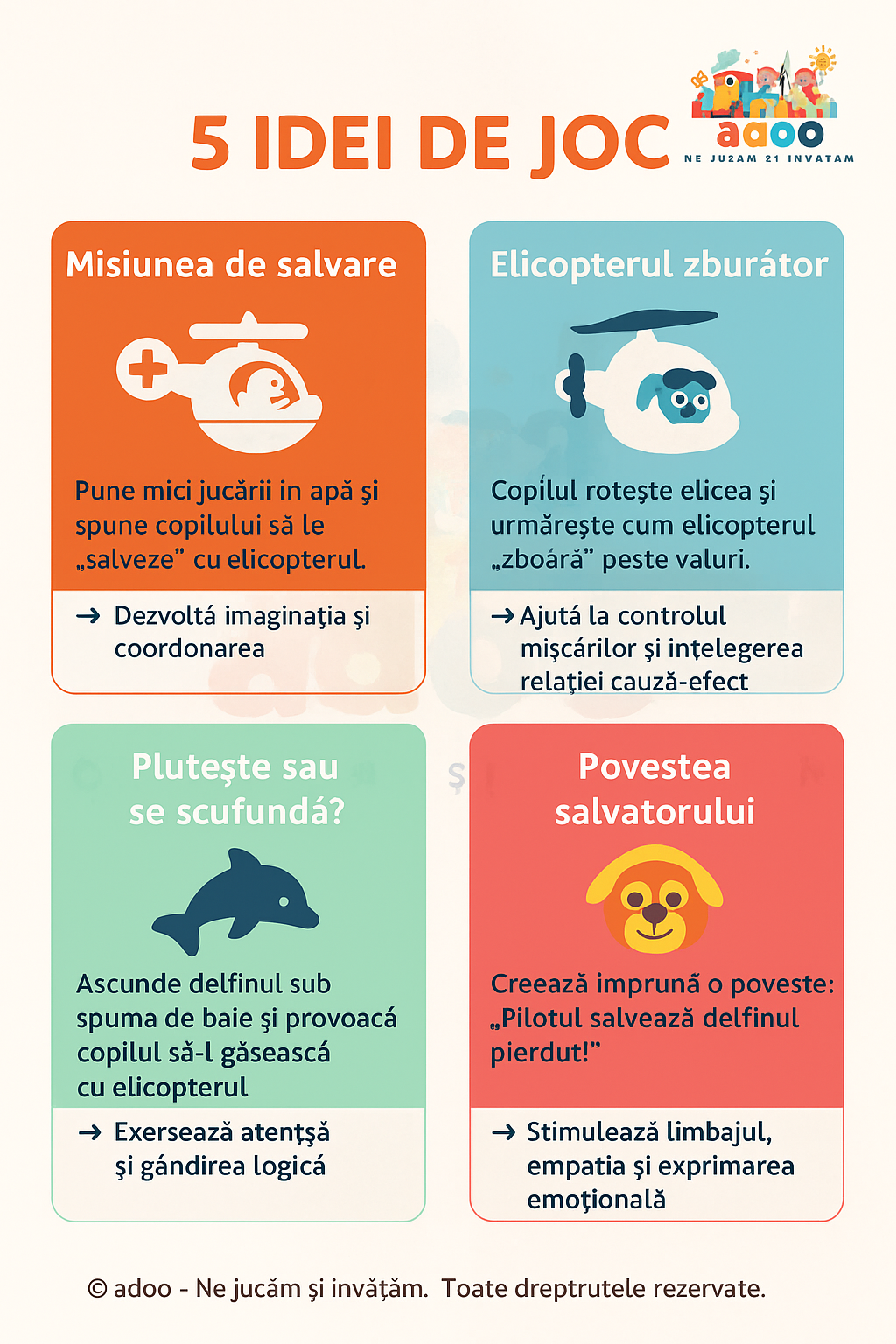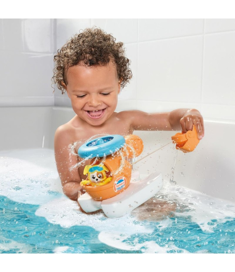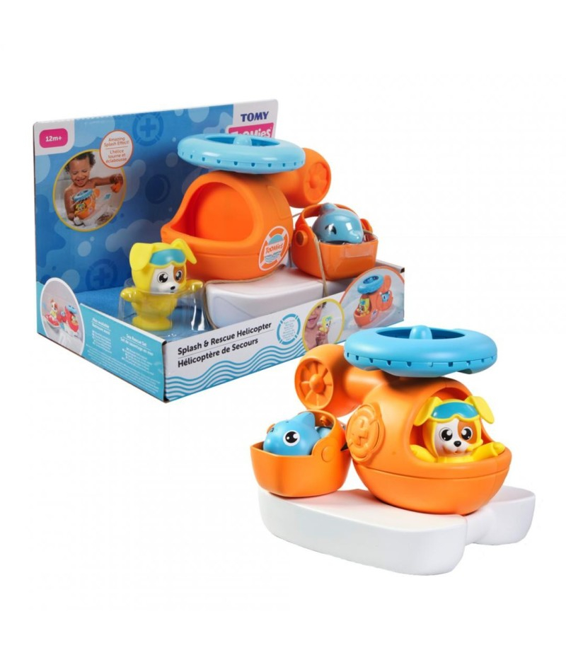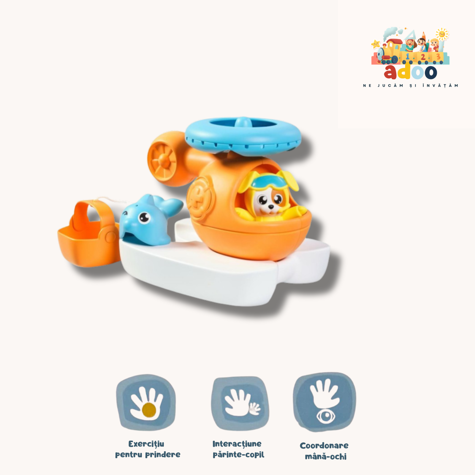Această jucărie de baie, este concepută pentru a transforma ora de baie într-o sesiune de joc de rol, stimulând imaginația și abilitățile motorii ale copiilor. Funcționalitate: Este o jucărie de baie, concepută să plutească pe apă. Design: Jucăria prezintă un elicopter (în culorile portocaliu și albastru) cu o figurină prietenoasă de cățel-pilot. Elemente de Joacă: Include un delfin și o găleată (sau coș de salvare) atașată cu o sfoară. Aceste componente permit jocul de rol „salvare”. Elicopterul are o elice care se poate învârti. Obiectiv Educațional: Încurajează jocul de rol, dezvoltă motricitatea fină (prin învârtirea elicei și manipularea găleții) și coordonarea mână-ochi.
