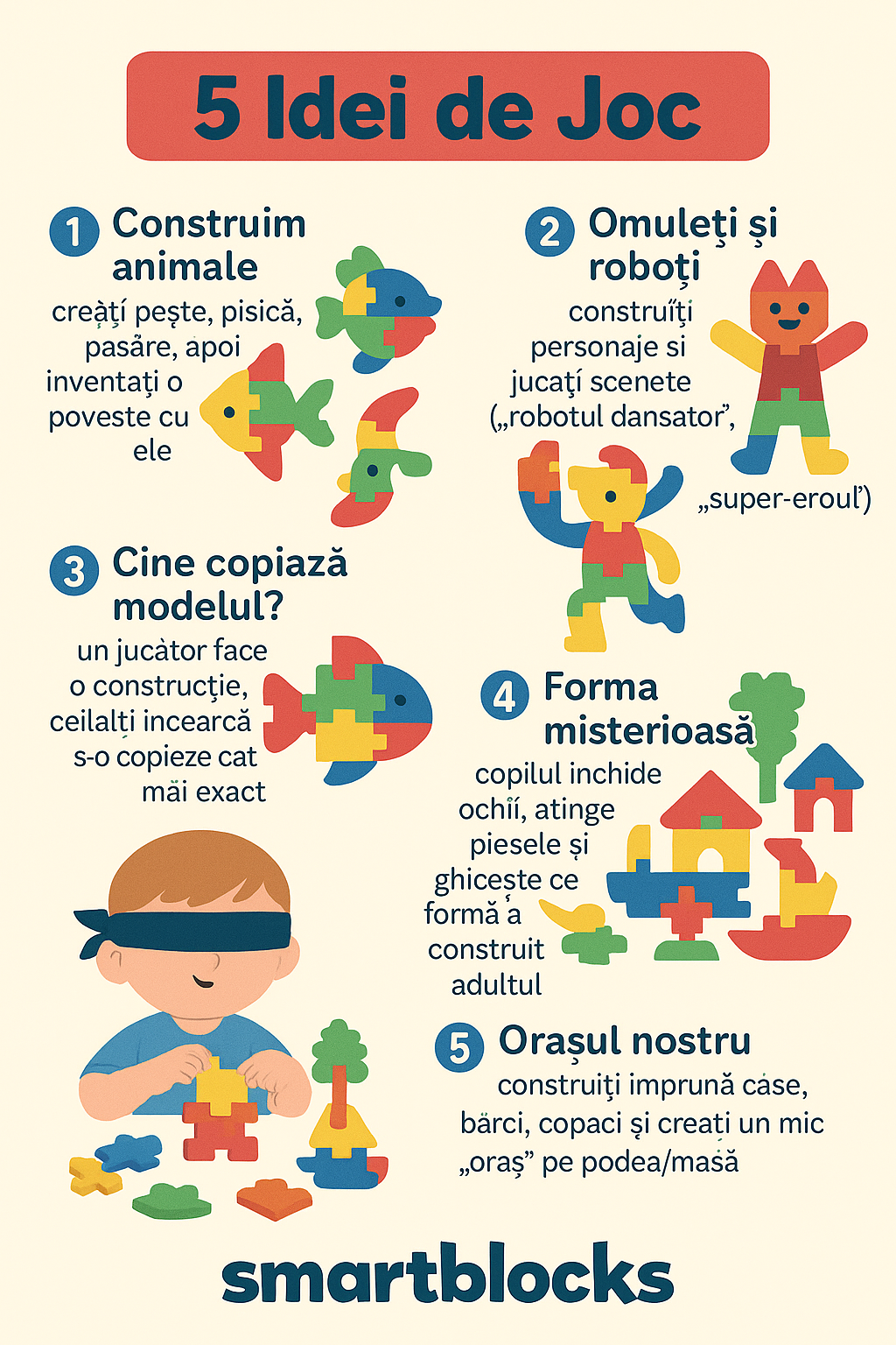 Jocul cu multe blocuri diferite dezvolta dexteritatea copilului. Optiuni nelimitate de creatie si constructie sporesc creativitatea copilului si dezvolta imaginatia. Blocurile colorate si diverse permit copilului sa recunoasca culorile si formele. Jocul cu blocuri ofera copilului crederea de a se misca singur si afecteaza pozitiv dezvoltarea senzoriala. vata pe copil sa se concentreze si sa se concentreze pe tot parcursul jocului. Este format din 160 de piese. Nu este potrivit pentru copiii sub 3 ani. Dimensiune cutie: 270*180*210 mm