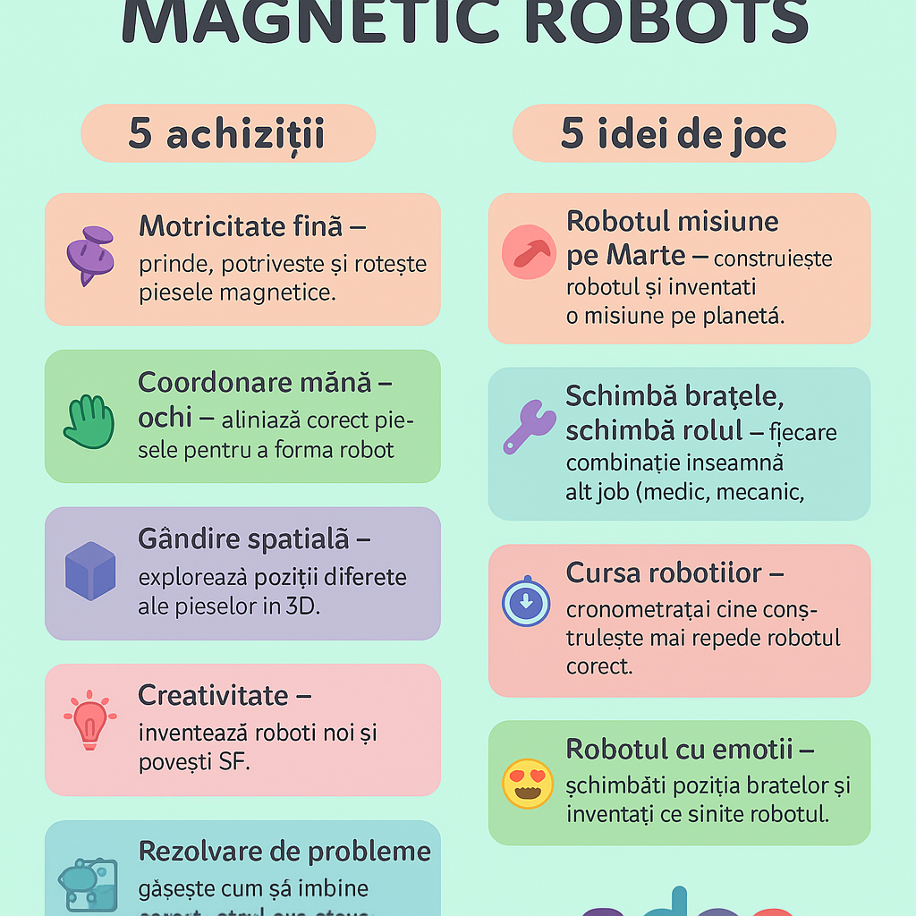 Transformă joaca într-o aventură creativă cu acest set de blocuri magnetice format din 7 piese colorate, ideal pentru copii curioși care vor să construiască rapid și ușor. Blocat într-o cutie compactă cu temă robot-albastru, setul este perfect pentru călătorii sau momente scurte de joacă. Fiecare piesă magnetică se conectează simplu cu celelalte, stimulând imaginația, coordonarea mână-ochi și gândirea spaţială. Potrivit pentru copiii de peste 3 ani, setul oferă o introducere distractivă în lumea construcțiilor magnetice, fără volum mare şi cu ușurință de depozitare.