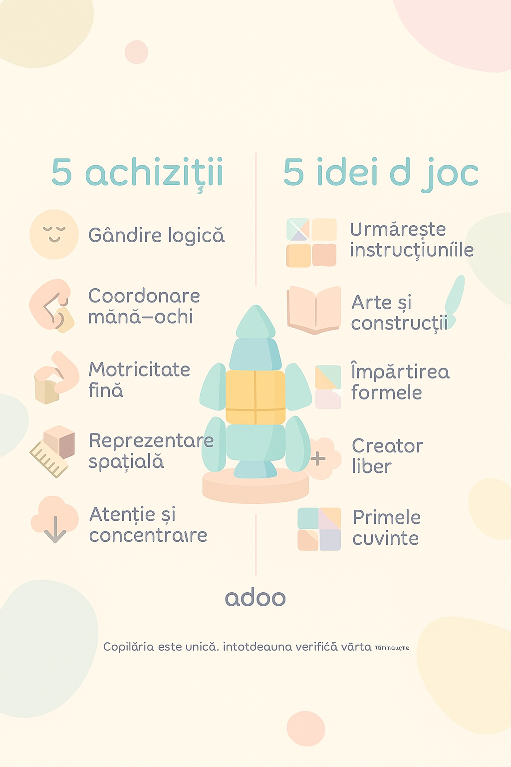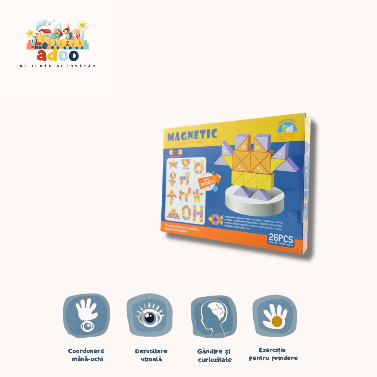 Acest set inteligent de construcţie cu 26 de piese magnetice multicolore este ideal pentru copiii de peste 3 ani care adoră să creeze şi să exploreze. Fiecare piesă are un magnet integrat şi se asamblează uşor cu celelalte, permițând construirea de structuri 2D şi 3D — case, turnuri, vehicule sau figuri abstracte. Prin joaca cu aceste piese copilul îşi dezvoltă coordonarea mână-ochi, gândirea spaţială, motricitatea fină şi imaginaţia, într-un mod captivant şi fără efort în plus. Materialele sunt sigure, durabile şi adaptate pentru utilizare repetată. Ambalajul compact îl face practic pentru depozitare sau transport, iar culorile vii şi formele variate atrag atenția copiilor. Un joc educativ şi distractiv, perfect pentru acasă, pentru momente de joacă individuală sau alături de prieteni, care combină creativitatea cu învăţarea prin joc.