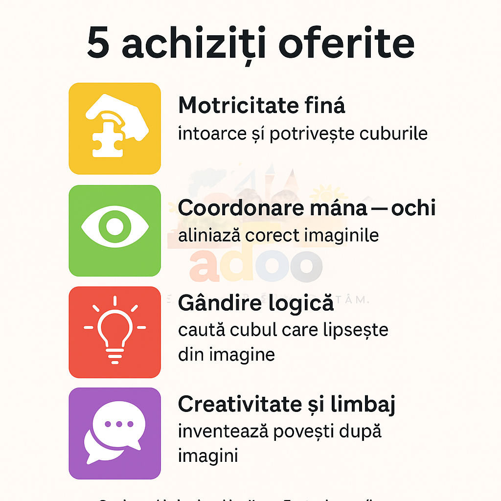 Setul inteligent de cuburi magnetice — 10 piese colorate într‑o cutie de depozitare — este perfect pentru copii de peste 3 ani care vor să construiască și să exploreze în joacă. Fiecare cub magnetic se asamblează rapid și stabil, astfel copilul poate crea turnuri, case sau animale imaginare. Jocul contribuie la dezvoltarea coordonării mână‑ochi, abilităților motrice fine și gândirii creative, fiind ușor de depozitat și ideal pentru momente de joacă independentă sau împreună cu prietenii.