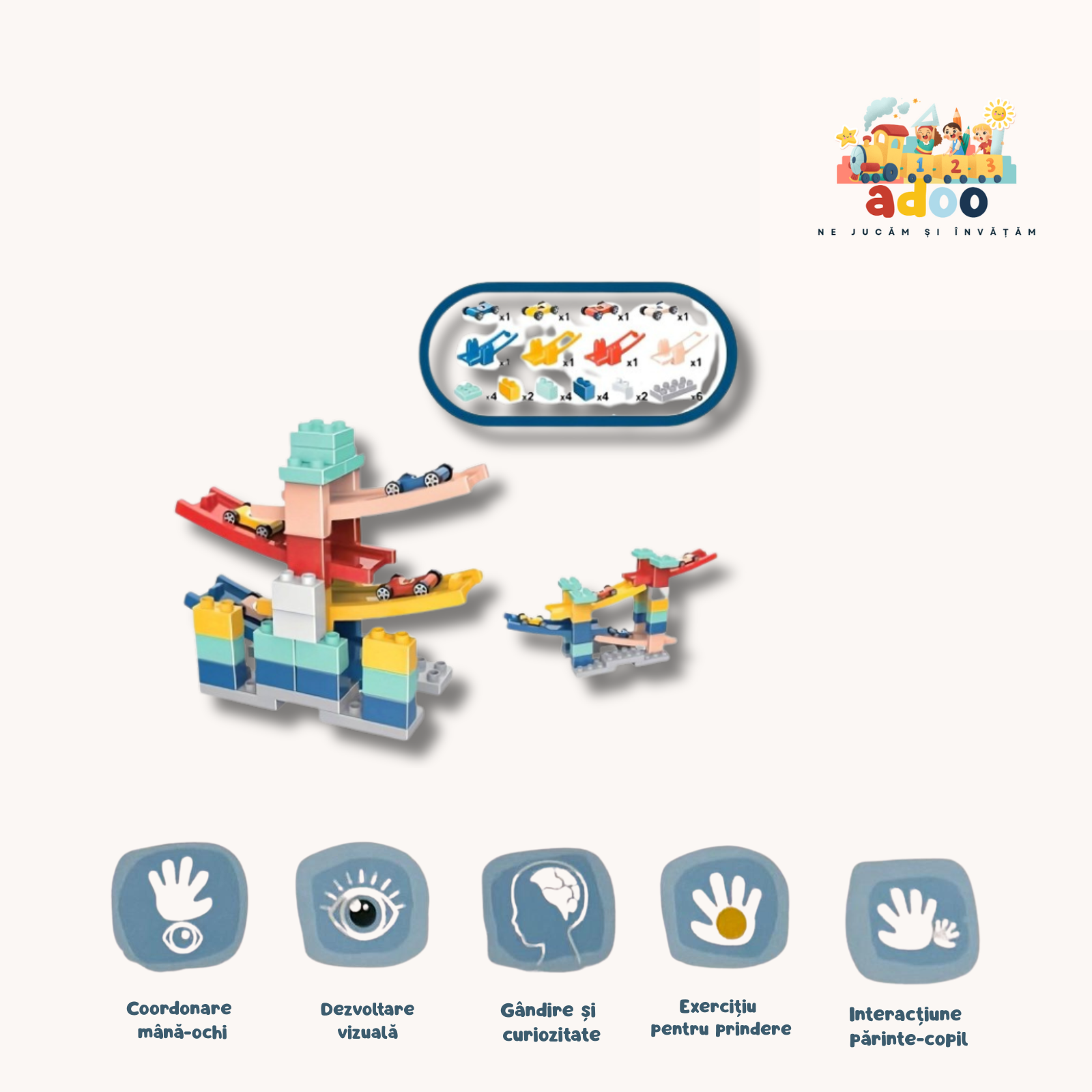 Acest set de construcţie pentru copii include 30 de piese tematice şi câteva maşinuţe, toate necesare pentru a asambla o rampă auto creativă şi distractivă. Copilul poate începe cu montarea pieselor – rampe, piese de susţinere, elemente de legătură – apoi îşi lansează maşinuţele pe circuitul propriu inventat. Jocul nu doar că oferă distracţie, dar sprijină şi dezvoltarea imaginaţiei, coordonării mână-ochi şi atenţiei la detalii. Piesele sunt fabricate din material plastic sigur, iar setul este recomandat pentru vârste de la aproximativ 3 ani în sus.