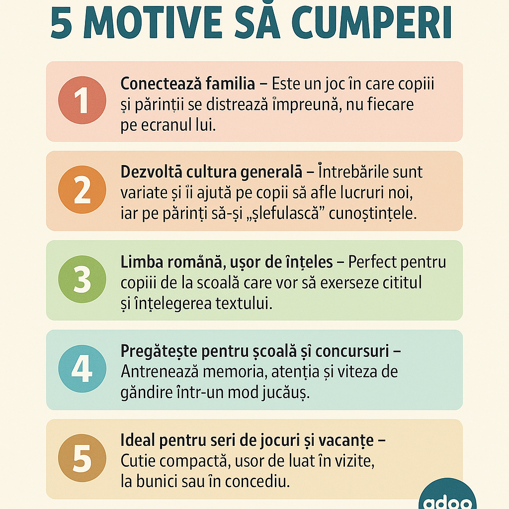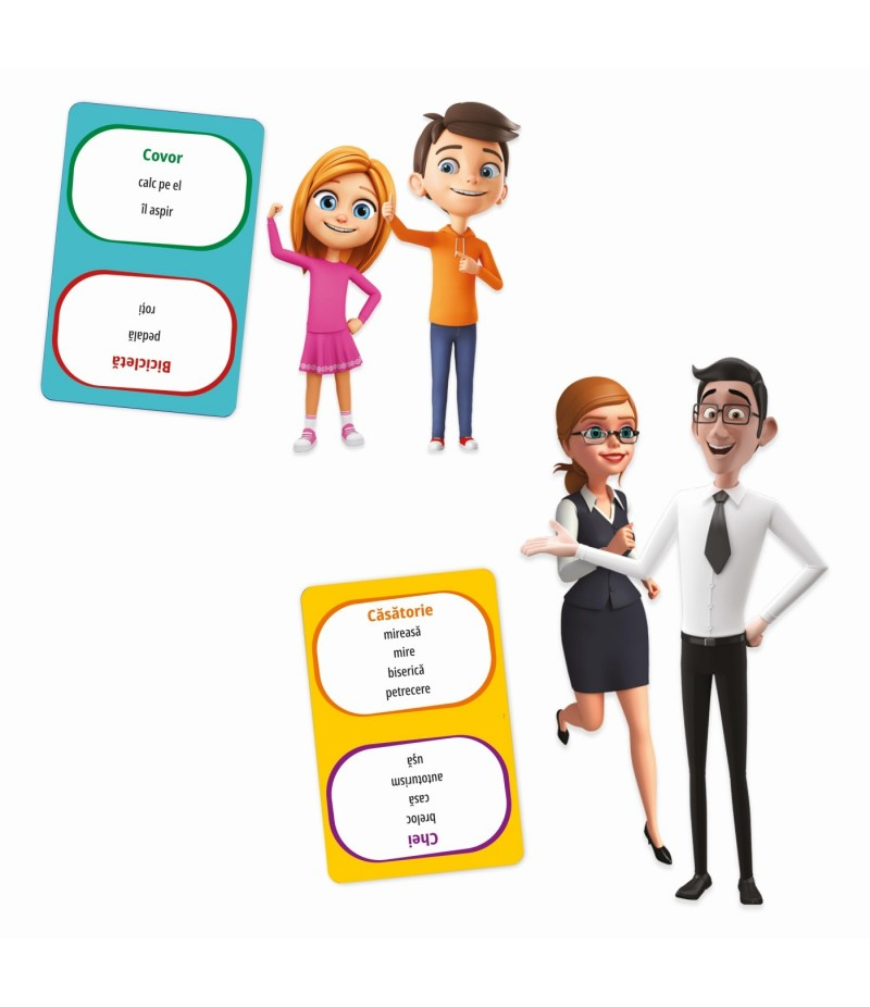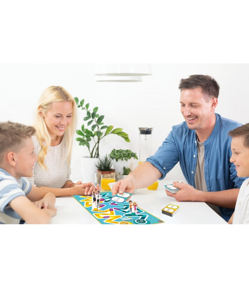 Cel mai distractiv joc de cunostinte generale pentru copii si parinti! Cu doua categorii de intrebari, familia este gata de confruntare. Raspunzand la intrebari de cultura generala, copiii au sansa de a demonstra ca oul e mai destept decat gaina! Prin raspunsuri corecte la intrebarile de pe cartonasele de joc, fiecare echipa va inainta pe tabla de joc. Atat cei mici cat si cei mari incearca sa ajunga la linia de final ghicind cat mai multe cuvinte posibil! Atentie, casutele speciale de pe tabla de jos pot intoarce jocul cu susul in jos! Este timpul sa dovediti cine este mai bun in cea mai mare confruntare in familie! Jocul contine: o 1 tabla de joc o 55 de carduri pentru cei mici o 55 de carduri pentru adulti o 2 pioni-figurina o 1 clepsidra o instructiuni. Dimensiuni: 250 x 250 x 52 mm Varsta recomandata: +7 ani Numar jucatori: 2+