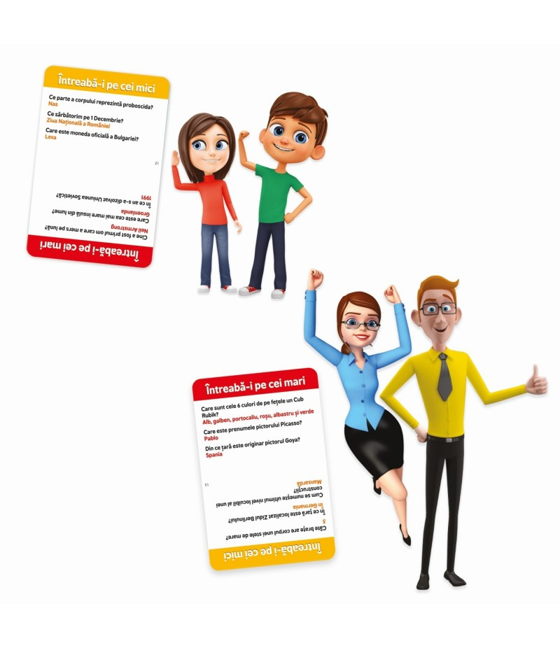 Cel mai distractiv joc de cunostinte generale pentru copii si parinti! Cu doua categorii de intrebari, familia este gata de confruntare. Raspunzand la intrebari de cultura generala, copiii au sansa de a demonstra ca oul e mai destept decat gaina! Prin raspunsuri corecte la intrebarile de pe cartonasele de joc, fiecare echipa va inainta pe tabla de joc. Aveti grija la pozitiile BONUS sau PEDEAPSA, pentru ca va pot ajuta sa inaintati, sau va pot intoarce cateva pozitii pe tabla de joc. Echipa care care ajunge prima la linia de Finish castiga! Jocul contine: tabla de joc, 110 cartonase de joc cu 660 de intrebari, 2 pioni si instructiuni de joc. Varsta 7+ ani. Jucatori: 2+.
