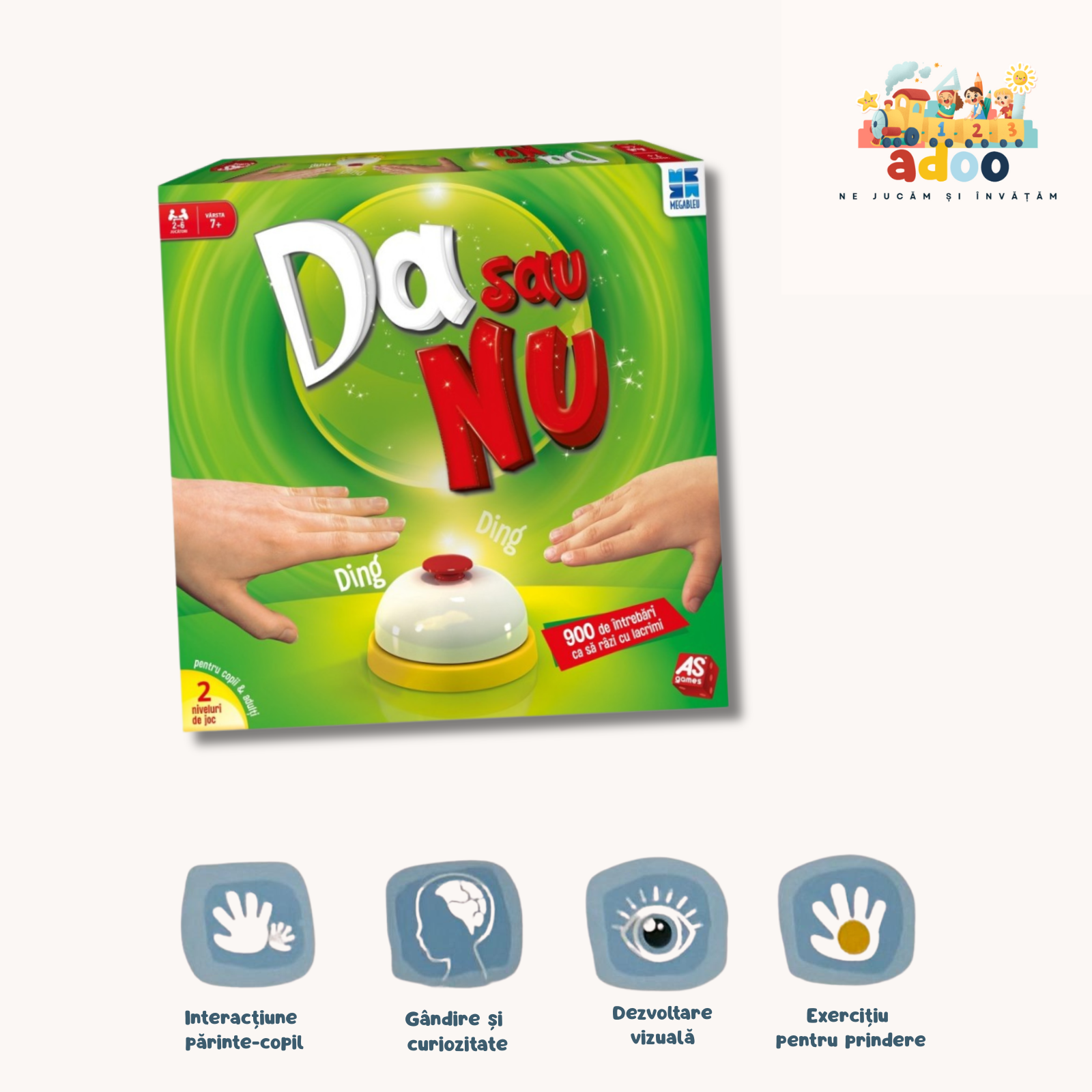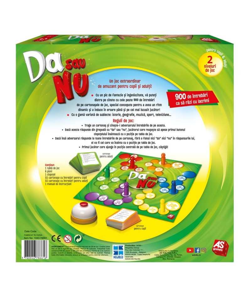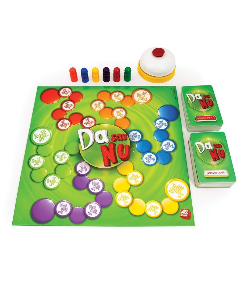 "Da sau Nu" - un joc de societate pentru 2- 6 jucatori sa se distreze pe cinste cu mai mult de 900 de intrebari capcana de pe cartonasele de joc, concepute cu iscusinta. Cartonasele contin intrebari pentru cei mici si mari, din categorii diverse: istorie, geografie, muzica, sport, televiziune ...Scopul jocului este de a raspunde la toate intrebarile fara a utiliza cuvintele Da sau Nu. Cel care raspunde la cele mai multe intrebari castiga! Jucatori: 2-6. Valori educative dezvoltatea: spiritul de echipa, logica, atentia si respectarea regulilor de joc. Varsta recomandata 7+. Functioneaza fara baterii. Continutul setului: 1 tabla de joc, 6 pioni, 110 cartonase, un clopotel, 1 manual de instructiuni. Jocul poate fi jucat si in varianta de calatorie fara utilizarea tablei de joc.