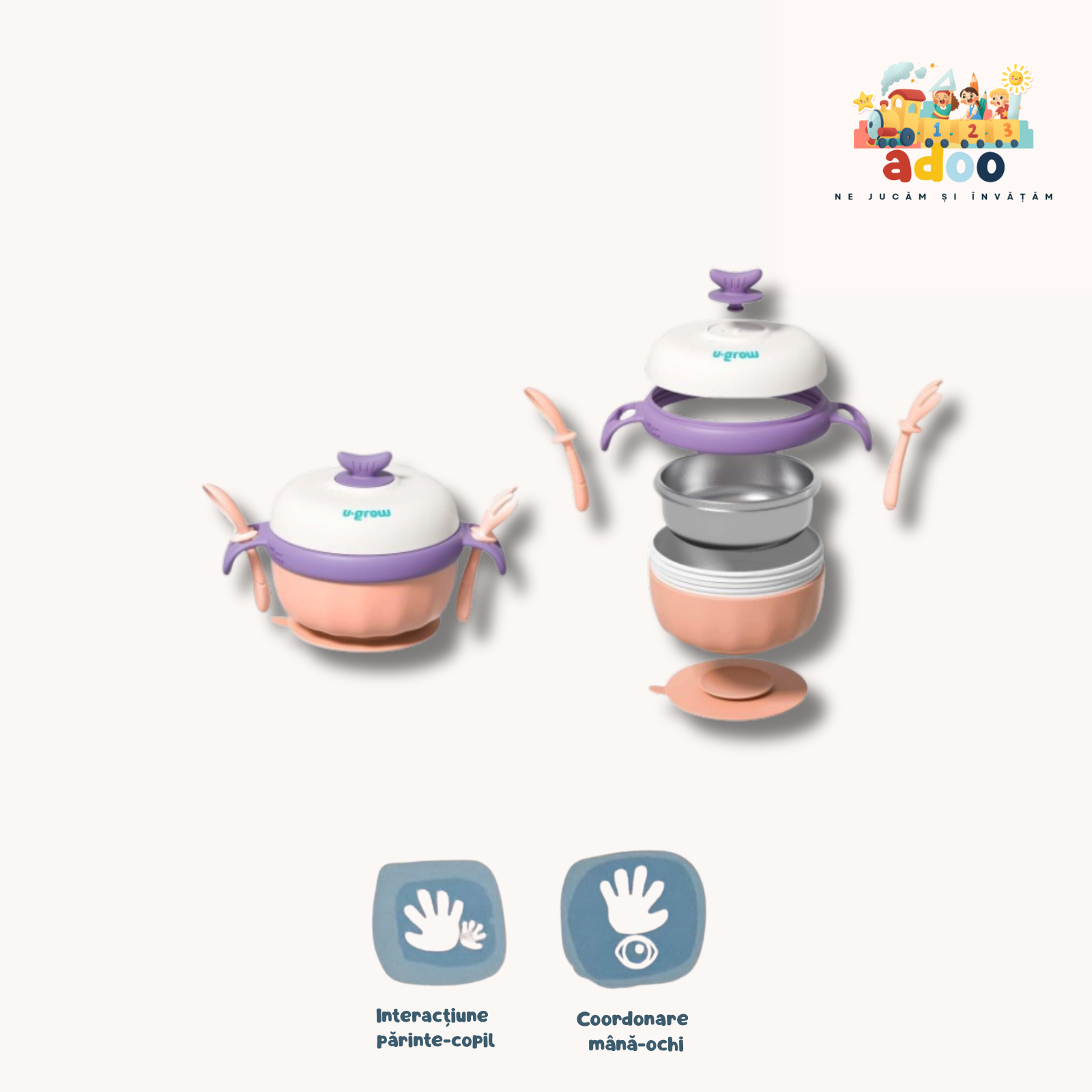 Bol termic , lingurita si furculita , baza antialunecare, mov, U-Grow Bolul termic este perfect pentru a pastra mancarea bebelusului la temperatura dorita: calda sau rece. Acesta are pereti dubli din polipropilena si inox si are in dotare si capac ce mentine temperatura continutului din interiorul recipientului, eliminand in acelasi timp riscurile eventualelor scurgeri sau varsari nedorite. De asemenea inelul tip ventuza ce vine la pachet ofera acestuia stabilitate si siguranta in timpul folosirii, fixandu-se cu usurinta de orice suprafata plana. Pentru a pastra o anumita temperatura in interiorul bolului se introduce apa fierbinte sau rece in bolul de polipropilena. Bolul interior este fabricat din inox. Produsul are in pachet si lingurita si furculita. Capacitate 350ml, varsta recomandata 6 luni + Se spala cu detergent pentru vase si apa calda Se spala in masina de spalat vase Se poate folosi sterilizator UV Nu apropiati produsul de foc/temperaturi inalte pentru a evita deformarea lui.