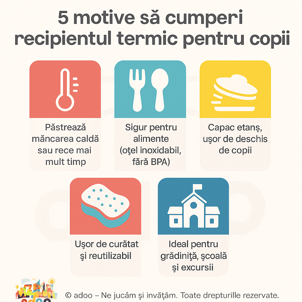 Termosul de mâncare U-Grow A-1110 este un accesoriu practic, conceput pentru a păstra mâncarea copilului la temperatura optimă, fie că este vorba de gustare caldă sau rece. Are un corp robust, izolat termic, ce asigură o bună retenție a căldurii sau răcirii, astfel încât mesele în deplasare devin mai comode și mai sigure. Capacitatea este suficientă pentru porții potrivite pentru copilași, iar deschiderea largă permite servirea rapidă și ușoară sau curăţarea facilă după utilizare. Designul este modern şi adaptat pentru utilizare de către copii – cu un exterior uşor de curăţat şi eventual antiderapant, pentru stabilitate pe suprafeţe de masă sau în scaunul maşinii. Este ideal pentru pic-nice, excursii sau orice deplasare în care copilul are nevoie de o masă la îndemână. Materialele sunt alese pentru siguranţă, fără compromisuri pentru confortul celor mici. Fiecare părinte îşi doreşte să ofere copilului său o experienţă de masă cât mai plăcută, iar cu acest termos mâncarea poate fi păstrată la temperatura potrivită până la momentul servitului. Uşor de integrat în rucsac sau geantă de călătorie, acest termos devine un companion util pentru zilele active.